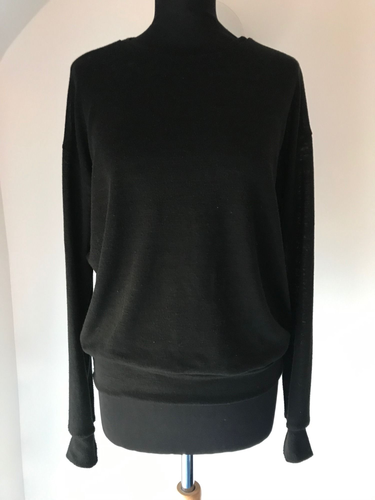 Der lässige schwarze Pulli mit überschnittenen Ärmeln und breiten Bündchen passt einfach zu jedem Outfit und kann sowohl schick kombiniert werden, als auch zuhause als Kuschelpulli dienen.
